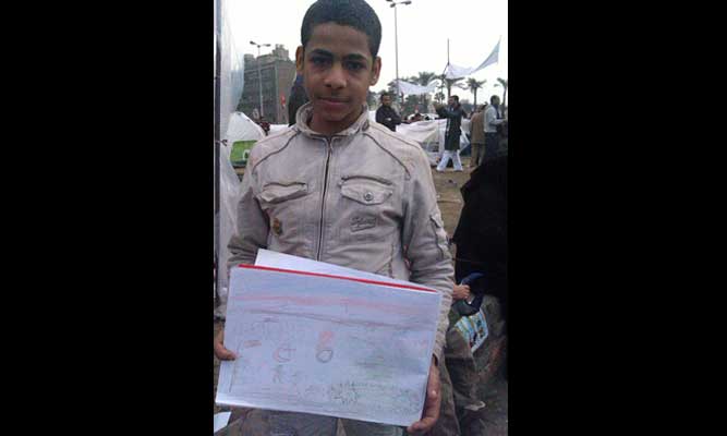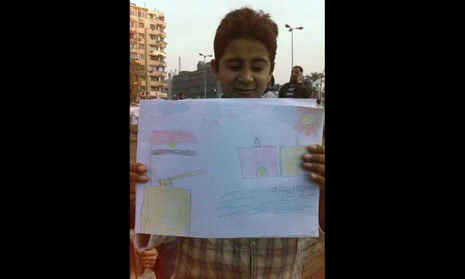 Another boy show off his pencil color painting depicting cross-religious harmony during a rally in Tahrir Square, Cairo. – Supplied photo